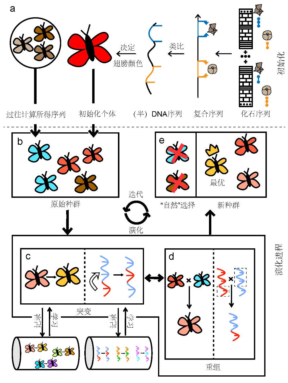 为了从海量数据中还原出真实的演化历程,古生物学家和人工智能专家联手,创新性地开发了受人工智能启发的新一代定量地层学算法——基于演化算法的约束最优化法(Constrained Optimisation-Evolutionary Algorithm,CONOP.EA)。该算法的思路很有意思:把每个可能的全球地层对比方案模拟成一段“DNA”,然后让这些“DNA”像生物一样经历变异、重组和自然选择。每一代“DNA”中,更优的方案被保留,较差的被淘汰。经过无数次的迭代,最终筛选出最合理、最一致的地层对比结果(图2)。